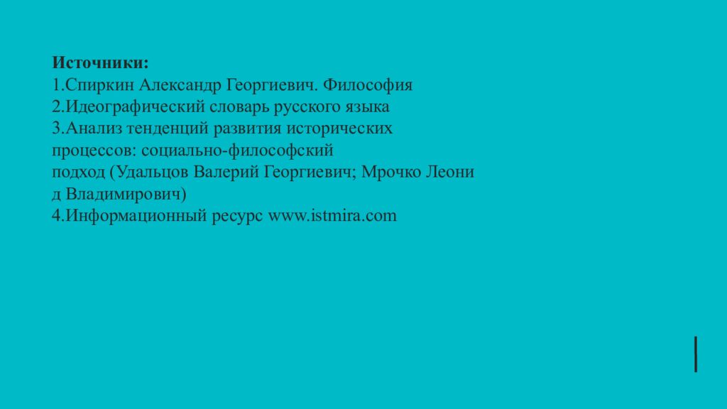 Источники: Спиркин Александр Георгиевич. Философия Идеографический словарь русского языка Анализ тенденций развития исторических процессов: социально-философский подход (Удальцов Валерий Георгиевич; Мрочко Леонид Владимирович) Информационный ресурс www.istmira.com