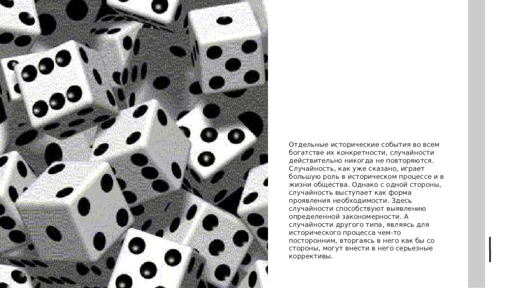 Отдельные исторические события во всем богатстве их конкретности, случайности действительно никогда не повторяются. Случайность, как уже сказано, играет большую роль в историческом процессе и в жизни общества. Однако с одной стороны, случайность выступает как форма проявления необходимости. Здесь случайности способствуют выявлению определенной закономерности. А случайности другого типа, являясь для исторического процесса чем-то посторонним, вторгаясь в него как бы со стороны, могут внести в него серьезные коррективы.