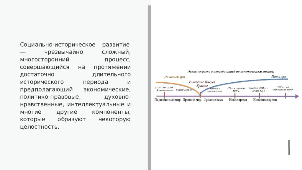 Социально-историческое развитие — чрезвычайно сложный, многосторонний процесс, совершающийся на протяжении достаточно длительного исторического периода и предполагающий экономические, политико-правовые, духовно-нравственные, интеллектуальные и многие другие компоненты, которые образуют некоторую целостность.