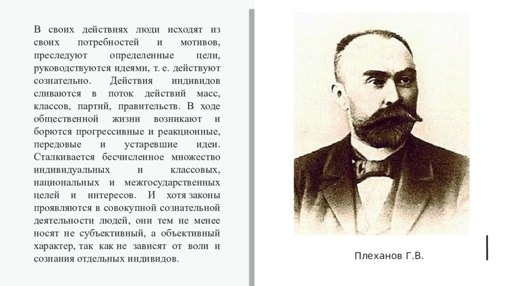 В своих действиях люди исходят из своих потребностей и мотивов, преследуют определенные цели, руководствуются идеями, т. е. действуют сознательно. Действия индивидов сливаются в поток действий масс, классов, партий, правительств. В ходе общественной жизни возникают и борются прогрессивные и реакционные, передовые и устаревшие идеи. Сталкивается бесчисленное множество индивидуальных и классовых, национальных и межгосударственных целей и интересов. И хотя законы проявляются в совокупной сознательной деятельности людей, они тем не менее носят не субъективный, а объективный характер, так как не зависят от воли и сознания отдельных индивидов. Плеханов Г.В.