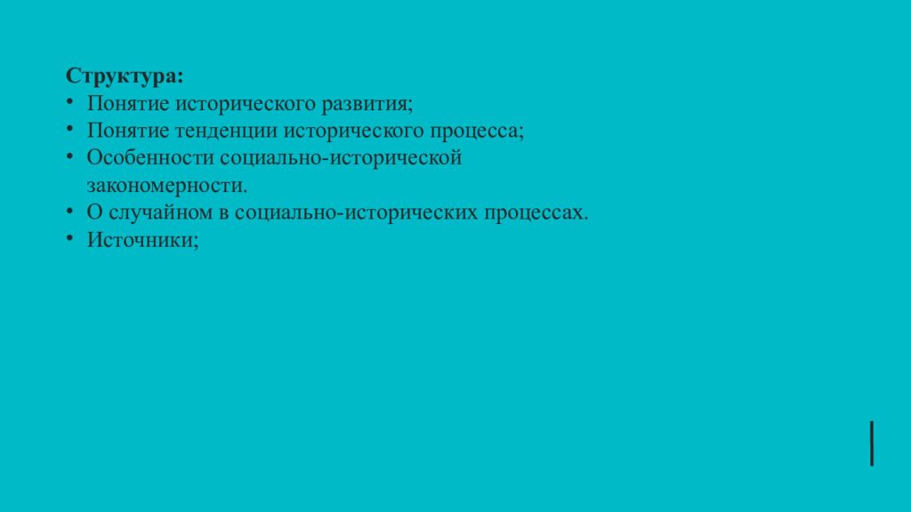 Структура: Понятие исторического развития; Понятие тенденции исторического процесса; Особенности социально-исторической закономерности. О случайном в социально-исторических процессах. Источники;