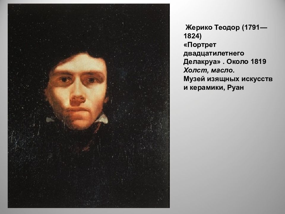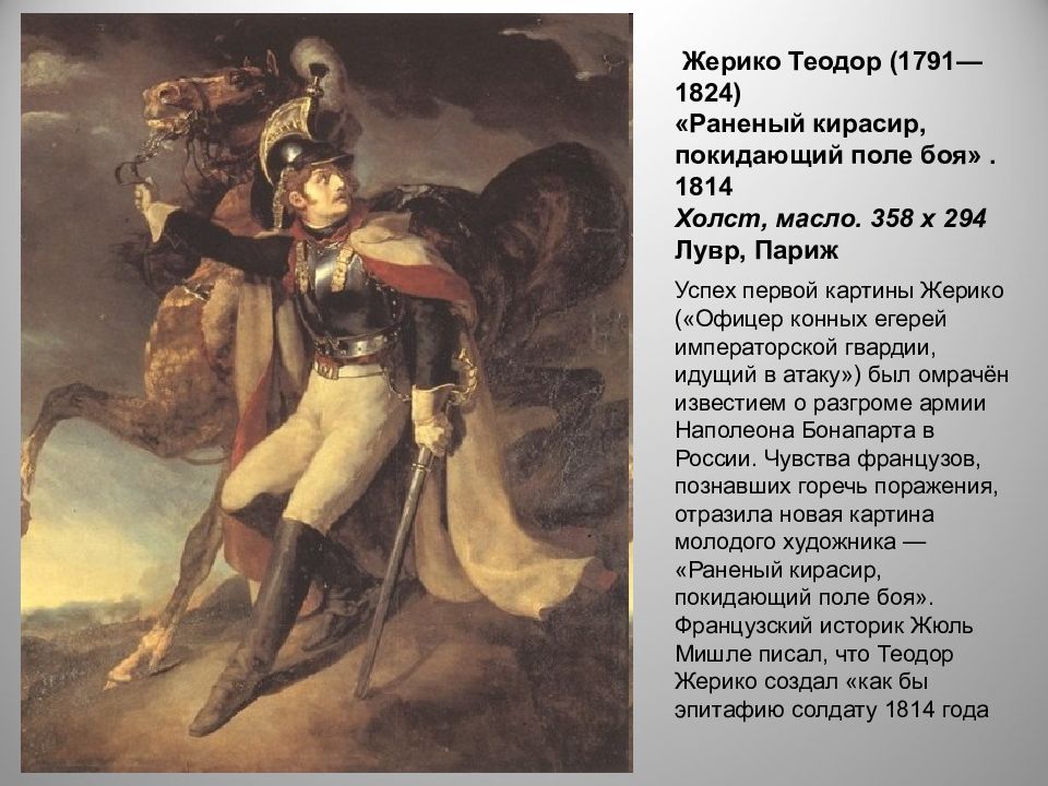 Жерико Теодор (1791—1824) «Раненый кирасир, покидающий поле боя». 1814 Холст, масло. 358 х 294 Лувр, Париж Успех первой картины Жерико («Офицер конных егерей императорской гвардии, идущий в атаку») был омрачён известием о разгроме армии Наполеона Бонапарта в России. Чувства французов, познавших горечь поражения, отразила новая картина молодого художника — «Раненый кирасир, покидающий поле боя». Французский историк Жюль Мишле писал, что Теодор Жерико создал «как бы эпитафию солдату 1814 года