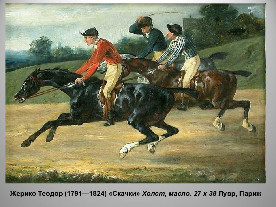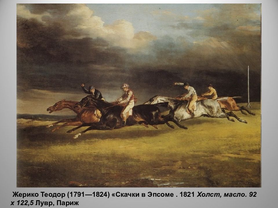 Жерико Теодор (1791—1824) «Скачки в Эпсоме. 1821 Холст, масло. 92 х 122,5 Лувр, Париж