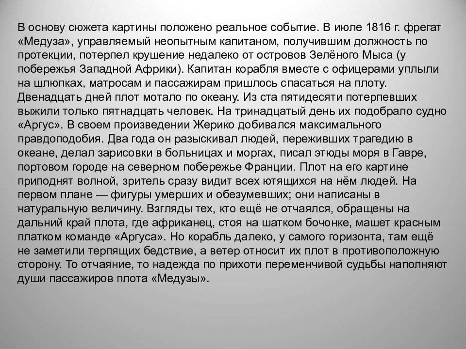 В основу сюжета картины положено реальное событие. В июле 1816 г. фрегат «Медуза», управляемый неопытным капитаном, получившим должность по протекции, потерпел крушение недалеко от островов Зелёного Мыса (у побережья Западной Африки). Капитан корабля вместе с офицерами уплыли на шлюпках, матросам и пассажирам пришлось спасаться на плоту. Двенадцать дней плот мотало по океану. Из ста пятидесяти потерпевших выжили только пятнадцать человек. На тринадцатый день их подобрало судно «Аргус». В своем произведении Жерико добивался максимального правдоподобия. Два года он разыскивал людей, переживших трагедию в океане, делал зарисовки в больницах и моргах, писал этюды моря в Гавре, портовом городе на северном побережье Франции. Плот на его картине приподнят волной, зритель сразу видит всех ютящихся на нём людей. На первом плане — фигуры умерших и обезумевших; они написаны в натуральную величину. Взгляды тех, кто ещё не отчаялся, обращены на дальний край плота, где африканец, стоя на шатком бочонке, машет красным платком команде «Аргуса». Но корабль далеко, у самого горизонта, там ещё не заметили терпящих бедствие, а ветер относит их плот в противоположную сторону. То отчаяние, то надежда по прихоти переменчивой судьбы наполняют души пассажиров плота «Медузы».