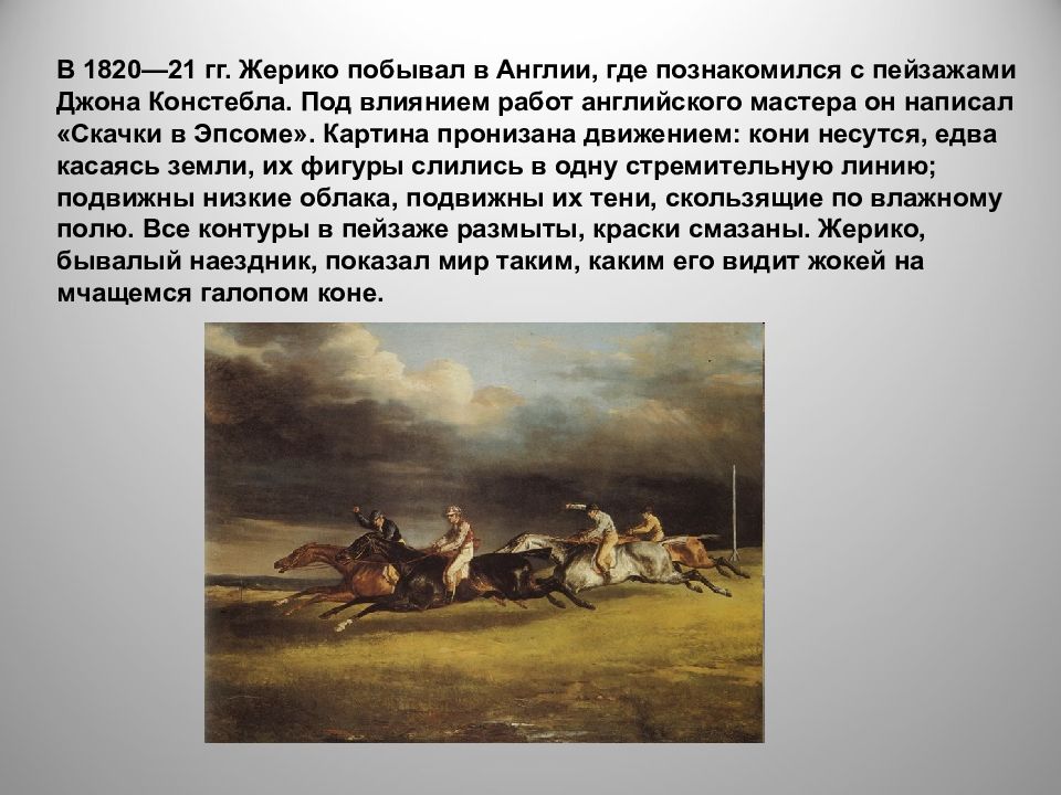 В 1820—21 гг. Жерико побывал в Англии, где познакомился с пейзажами Джона Констебла. Под влиянием работ английского мастера он написал «Скачки в Эпсоме». Картина пронизана движением: кони несутся, едва касаясь земли, их фигуры слились в одну стремительную линию; подвижны низкие облака, подвижны их тени, скользящие по влажному полю. Все контуры в пейзаже размыты, краски смазаны. Жерико, бывалый наездник, показал мир таким, каким его видит жокей на мчащемся галопом коне.