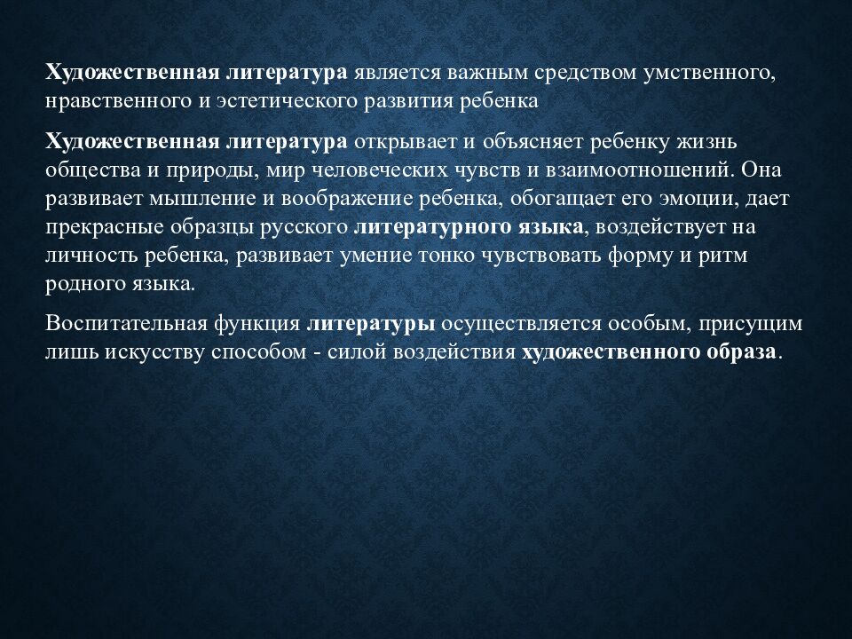 Художественная литература является важным средством умственного, нравственного и эстетического развития ребенка Художественная литература открывает и объясняет ребенку жизнь общества и природы, мир человеческих чувств и взаимоотношений. Она развивает мышление и воображение ребенка, обогащает его эмоции, дает прекрасные образцы русского литературного языка, воздействует на личность ребенка, развивает умение тонко чувствовать форму и ритм родного языка. Воспитательная функция литературы осуществляется особым, присущим лишь искусству способом - силой воздействия художественного образа.