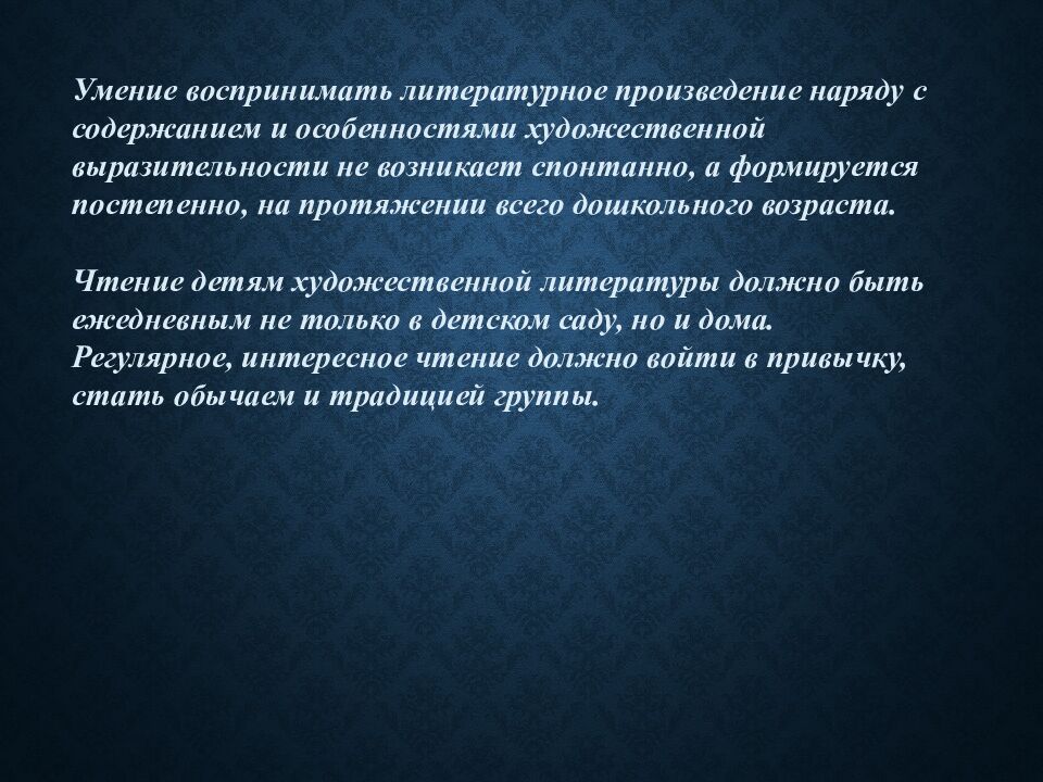Умение воспринимать литературное произведение наряду с содержанием и особенностями художественной выразительности не возникает спонтанно, а формируется постепенно, на протяжении всего дошкольного возраста. Ч тение детям художественной литературы должно быть ежедневным не только в детском саду, но и дома. Регулярное, интересное чтение должно войти в привычку, стать обычаем и традицией группы.