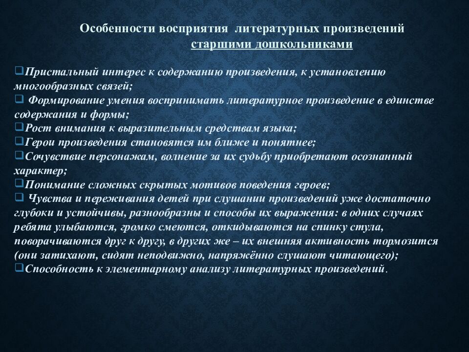 Особенности восприятия литературных произведений старшими дошкольниками Пристальный интерес к содержанию произведения, к установлению многообразных связей; Формирование умения воспринимать литературное произведение в единстве содержания и формы; Рост внимания к выразительным средствам языка; Герои произведения становятся им ближе и понятнее; Сочувствие персонажам, волнение за их судьбу приобретают осознанный характер; Понимание сложных скрытых мотивов поведения героев; Чувства и переживания детей при слушании произведений уже достаточно глубоки и устойчивы, разнообразны и способы их выражения: в одних случаях ребята улыбаются, громко смеются, откидываются на спинку стула, поворачиваются друг к другу, в других же – их внешняя активность тормозится (они затихают, сидят неподвижно, напряжённо слушают читающего); Способность к элементарному анализу литературных произведений.