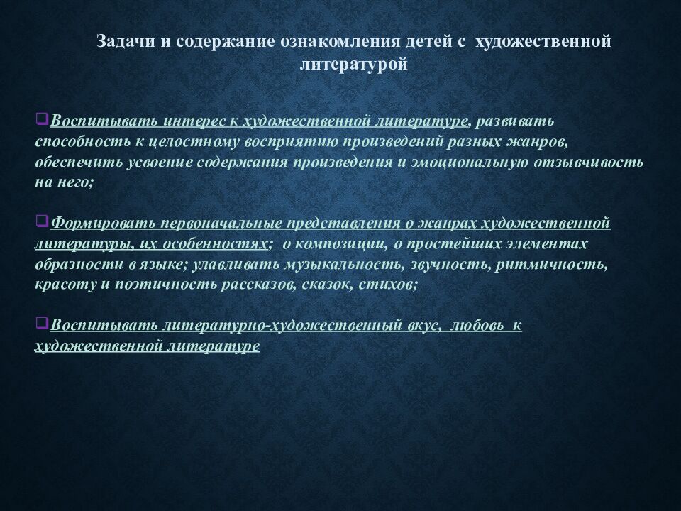 Задачи и содержание ознакомления детей с художественной литературой Воспитывать интерес к художественной литературе, развивать способность к целостному восприятию произведений разных жанров, обеспечить усвоение содержания произведения и эмоциональную отзывчивость на него; Формировать первоначальные представления о жанрах художественной литературы, их особенностях ; о композиции, о простейших элементах образности в языке; улавливать музыкальность, звучность, ритмичность, красоту и поэтичность рассказов, сказок, стихов; Воспитывать литературно-художественный вкус, любовь к художественной литературе