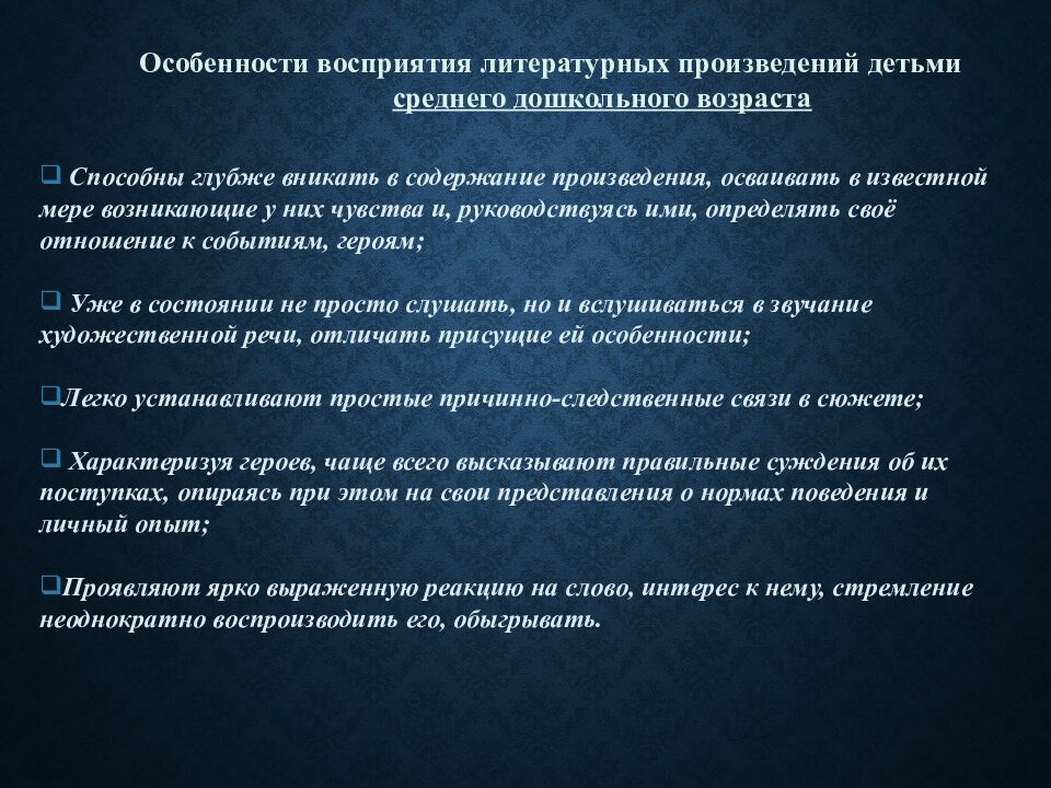 Особенности восприятия литературных произведений детьми среднего дошкольного возраста Способны глубже вникать в содержание произведения, осваивать в известной мере возникающие у них чувства и, руководствуясь ими, определять своё отношение к событиям, героям; Уже в состоянии не просто слушать, но и вслушиваться в звучание художественной речи, отличать присущие ей особенности; Легко устанавливают простые причинно-следственные связи в сюжете; Характеризуя героев, чаще всего высказывают правильные суждения об их поступках, опираясь при этом на свои представления о нормах поведения и личный опыт; Проявляют ярко выраженную реакцию на слово, интерес к нему, стремление неоднократно воспроизводить его, обыгрывать.