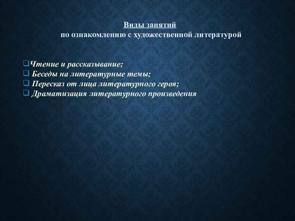 Виды занятий по ознакомлению с художественной литературой Чтение и рассказывание; Беседы на литературные темы; Пересказ от лица литературного героя; Драматизация литературного произведения