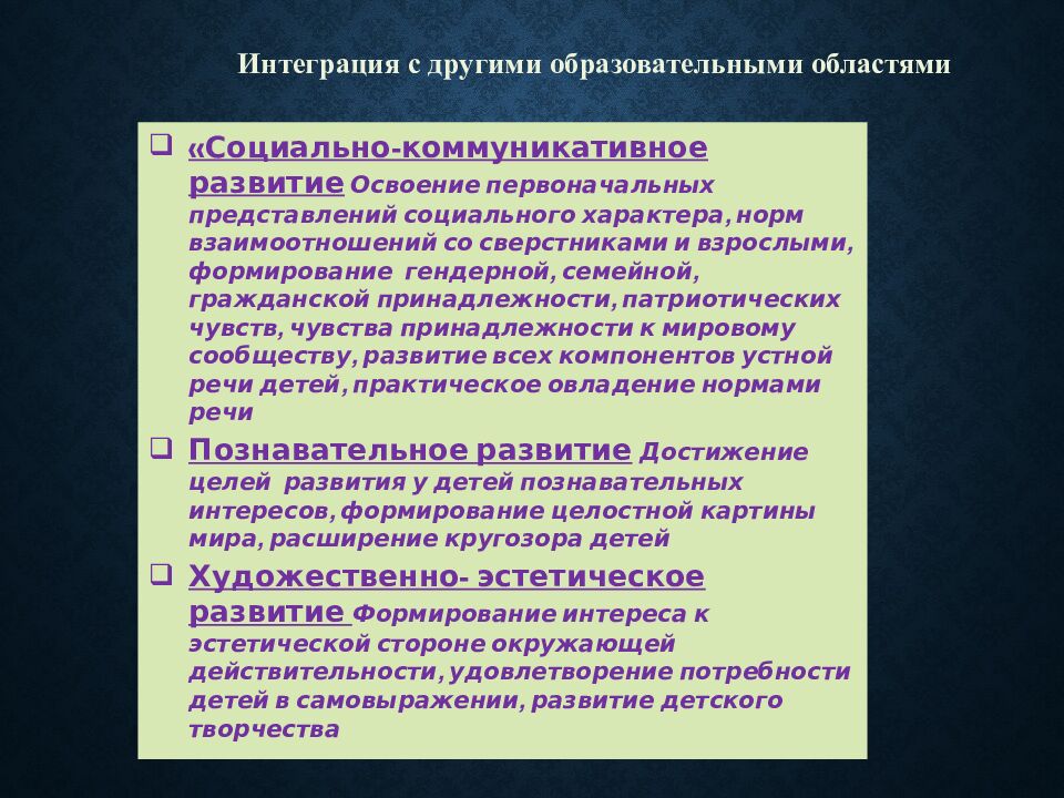 Интеграция с другими образовательными областями «Социально-коммуникативное развитие Освоение первоначальных представлений социального характера, норм взаимоотношений со сверстниками и взрослыми, формирование гендерной, семейной, гражданской принадлежности, патриотических чувств, чувства принадлежности к мировому сообществу, развитие всех компонентов устной речи детей, практическое овладение нормами речи Познавательное развитие Достижение целей развития у детей познавательных интересов, формирование целостной картины мира, расширение кругозора детей Художественно- эстетическое развитие Формирование интереса к эстетической стороне окружающей действительности, удовлетворение потребности детей в самовыражении, развитие детского творчества
