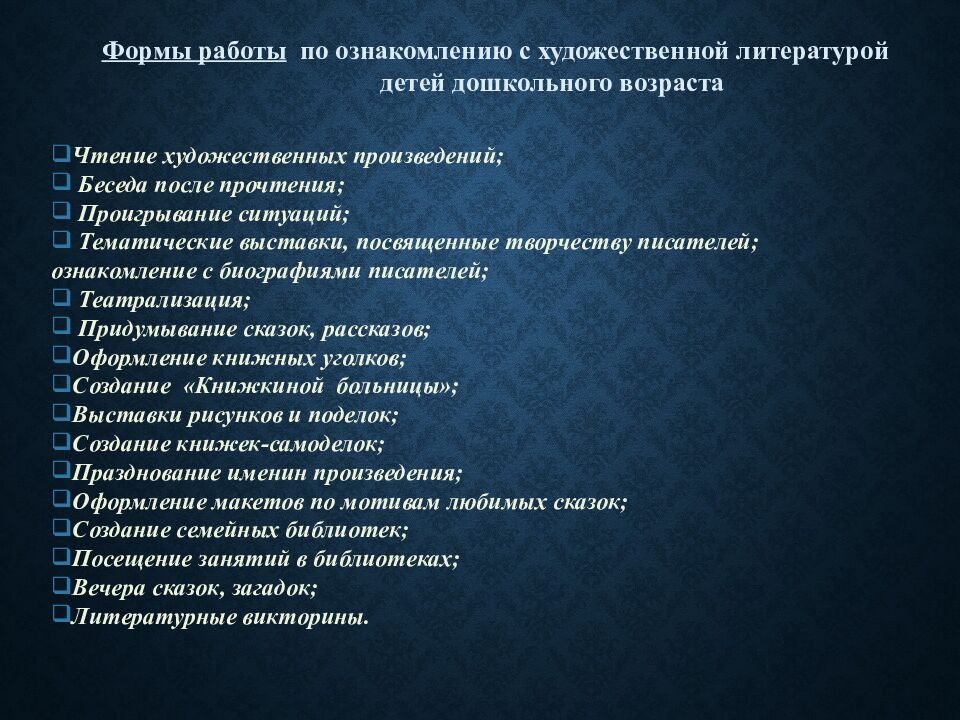 Формы работы по ознакомлению с художественной литературой детей дошкольного возраста Чтение художественных произведений; Беседа после прочтения; Проигрывание ситуаций; Тематические выставки, посвященные творчеству писателей; ознакомление с биографиями писателей; Театрализация; Придумывание сказок, рассказов; Оформление книжных уголков; Создание « Книжкиной больницы»; Выставки рисунков и поделок; Создание книжек-самоделок; Празднование именин произведения; Оформление макетов по мотивам любимых сказок; Создание семейных библиотек; Посещение занятий в библиотеках; Вечера сказок, загадок; Литературные викторины.