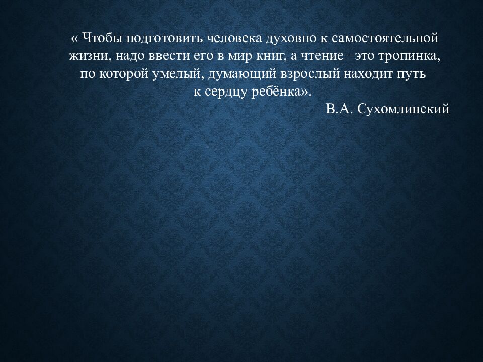 « Чтобы подготовить человека духовно к самостоятельной жизни, надо ввести его в мир книг, а чтение –это тропинка, по которой умелый, думающий взрослый находит путь к сердцу ребёнка». В.А. Сухомлинский
