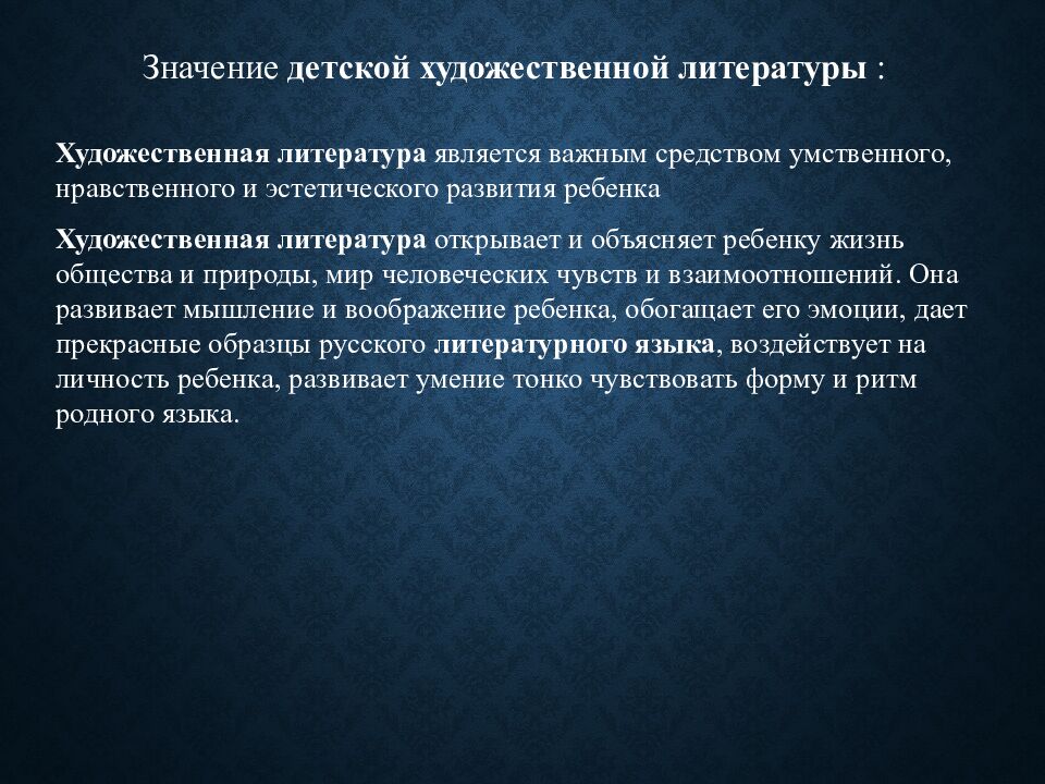 Значение детской художественной литературы : Художественная литература является важным средством умственного, нравственного и эстетического развития ребенка Художественная литература открывает и объясняет ребенку жизнь общества и природы, мир человеческих чувств и взаимоотношений. Она развивает мышление и воображение ребенка, обогащает его эмоции, дает прекрасные образцы русского литературного языка, воздействует на личность ребенка, развивает умение тонко чувствовать форму и ритм родного языка.