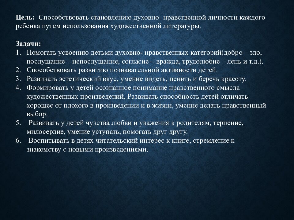 Цель: Способствовать становлению духовно- нравственной личности каждого ребенка путем использования художественной литературы. Задачи: Помогать усвоению детьми духовно- нравственных категорий(добро – зло, послушание – непослушание, согласие – вражда, трудолюбие – лень и т.д.). Способствовать развитию познавательной активности детей. Развивать эстетический вкус, умение видеть, ценить и беречь красоту. Формировать у детей осознанное понимание нравственного смысла художественных произведений. Развивать способность детей отличать хорошее от плохого в произведении и в жизни, умение делать нравственный выбор. Развивать у детей чувства любви и уважения к родителям, терпение, милосердие, умение уступать, помогать друг другу. Воспитывать в детях читательский интерес к книге, стремление к знакомству с новыми произведениями.
