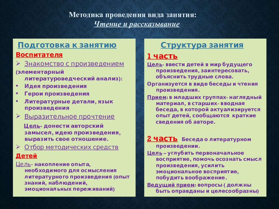 Методика проведения вида занятия: Чтение и рассказывание Подготовка к занятию Воспитателя Знакомство с произведением (элементарный литературоведческий анализ): Идея произведения Герои произведения Литературные детали, язык произведения Выразительное прочтение Цель - донести авторский замысел, идею произведения, выразить свое отношение. Отбор методических средств Детей Цель - накопление опыта, необходимого для осмысления литературного произведения (опыт знаний, наблюдений, эмоциональных переживаний) Структура занятия 1 часть Цель - ввести детей в мир будущего произведения, заинтересовать, объяснить трудные слова. Организуется в виде беседы и чтения произведения. Прием : в младших группах- наглядный материал, в старших- вводная беседа, в которой актуализируется опыт детей, сообщаются краткие сведения об авторе. 2 часть Беседа о литературном произведении. Цель – углубить первоначальное восприятие, помочь осознать смысл произведения, усилить эмоциональное восприятие, побудить воображение. Ведущий прием : вопросы ( должны быть оправданы и целесообразны)