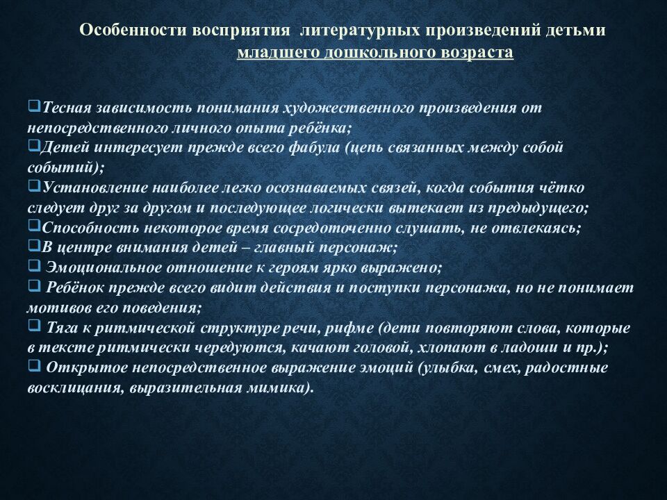 Особенности восприятия литературных произведений детьми младшего дошкольного возраста Тесная зависимость понимания художественного произведения от непосредственного личного опыта ребёнка; Детей интересует прежде всего фабула (цепь связанных между собой событий); Установление наиболее легко осознаваемых связей, когда события чётко следует друг за другом и последующее логически вытекает из предыдущего; Способность некоторое время сосредоточенно слушать, не отвлекаясь; В центре внимания детей – главный персонаж; Эмоциональное отношение к героям ярко выражено; Ребёнок прежде всего видит действия и поступки персонажа, но не понимает мотивов его поведения; Тяга к ритмической структуре речи, рифме (дети повторяют слова, которые в тексте ритмически чередуются, качают головой, хлопают в ладоши и пр.); Открытое непосредственное выражение эмоций (улыбка, смех, радостные восклицания, выразительная мимика).
