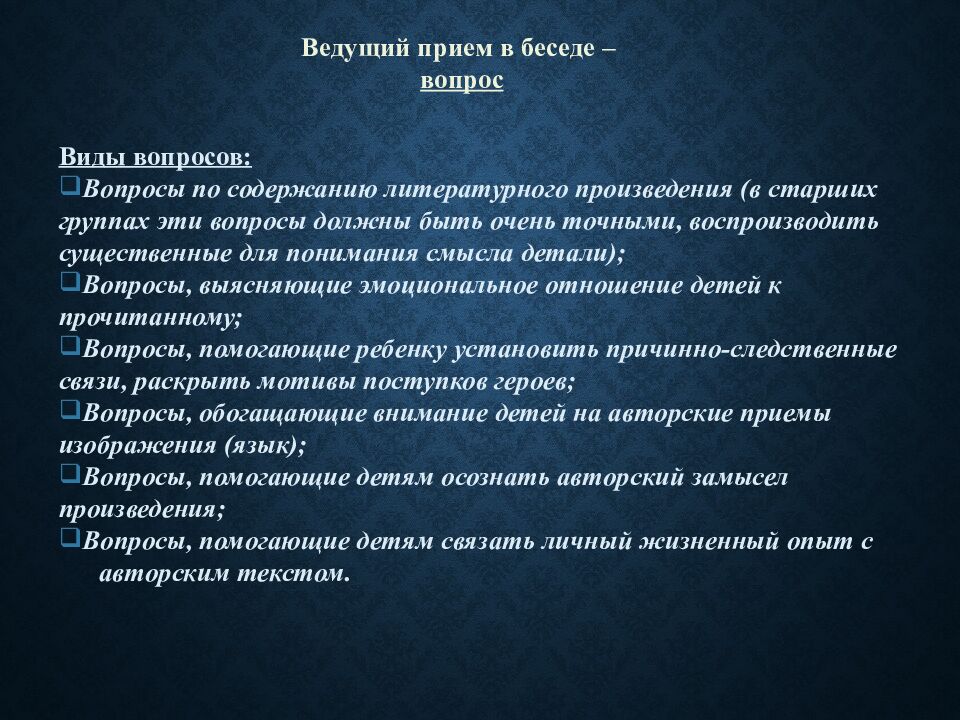 Ведущий прием в беседе – вопрос Виды вопросов: Вопросы по содержанию литературного произведения (в старших группах эти вопросы должны быть очень точными, воспроизводить существенные для понимания смысла детали); Вопросы, выясняющие эмоциональное отношение детей к прочитанному; Вопросы, помогающие ребенку установить причинно-следственные связи, раскрыть мотивы поступков героев; Вопросы, обогащающие внимание детей на авторские приемы изображения (язык); Вопросы, помогающие детям осознать авторский замысел произведения; Вопросы, помогающие детям связать личный жизненный опыт с авторским текстом.