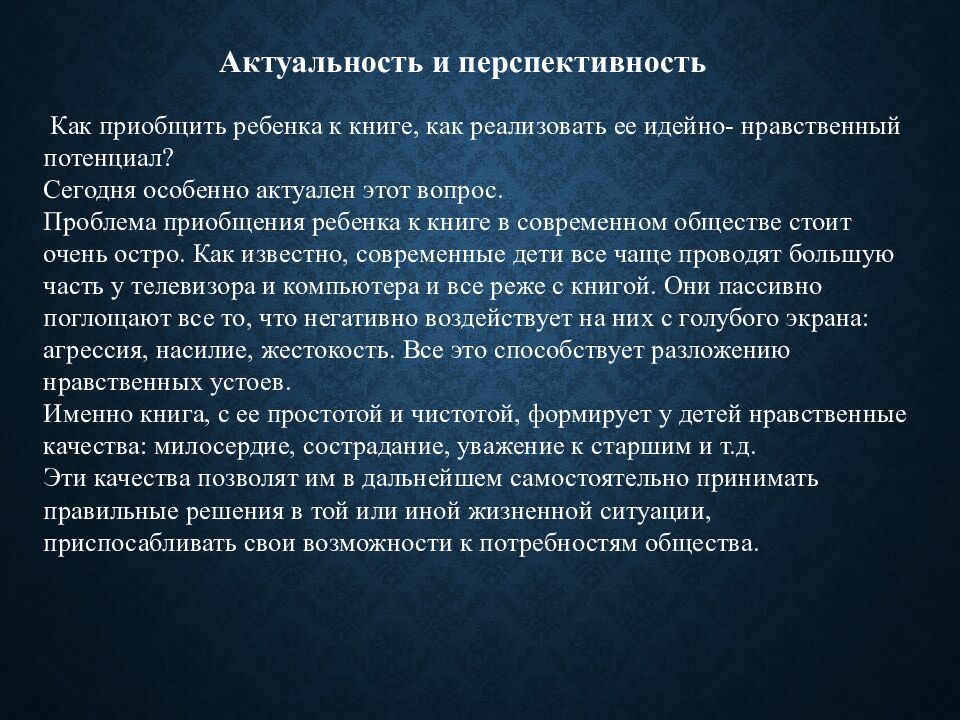 Как приобщить ребенка к книге, как реализовать ее идейно- нравственный потенциал? Сегодня особенно актуален этот вопрос. Проблема приобщения ребенка к книге в современном обществе стоит очень остро. Как известно, современные дети все чаще проводят большую часть у телевизора и компьютера и все реже с книгой. Они пассивно поглощают все то, что негативно воздействует на них с голубого экрана: агрессия, насилие, жестокость. Все это способствует разложению нравственных устоев. Именно книга, с ее простотой и чистотой, формирует у детей нравственные качества: милосердие, сострадание, уважение к старшим и т.д. Эти качества позволят им в дальнейшем самостоятельно принимать правильные решения в той или иной жизненной ситуации, приспосабливать свои возможности к потребностям общества. Актуальность и перспективность