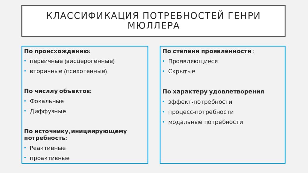 По происхождению: первичные ( висцерогенные ) вторичные (психогенные ) По числлу объектов: Фокальные Диффузные По источнику, инициирующему потребность: Реактивные проактивные По степени проявленности : Проявляющиеся Скрытые По характеру удовлетворения эффект-потребности процесс-потребности модальные потребности Классификация потребностей Генри Мюллера