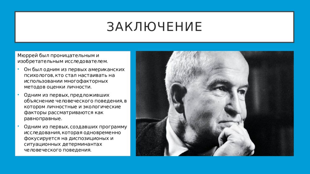 Мюррей был проницательным и изобретательным исследователем. Он был одним из первых американских психологов, кто стал настаивать на использовании многофакторных методов оценки личности. Одним из первых, предложивших объяснение человеческого поведения, в котором личностные и экологические факторы рассматриваются как равноправные. Одним из первых, создавших программу исследования, которая одновременно фокусируется на диспозиционых и ситуационных детерминантах человеческого поведения.