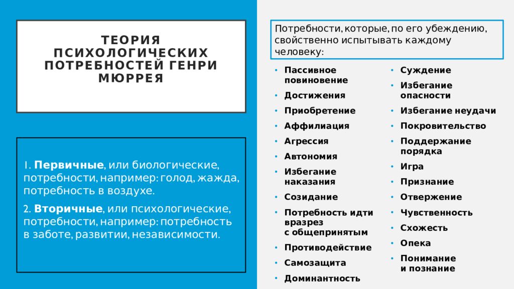 Пассивное повиновение Достижения Приобретение Аффилиация Агрессия Автономия Избегание наказания Созидание Потребность идти вразрез с общепринятым Противодействие Самозащита Доминантность Внимание Суждение Избегание опасности Избегание неудачи Покровительство Поддержание порядка Игра Признание Отвержение Чувственность Схожесть Опека Понимание и познание 1. Первичные, или биологические, потребности, например: голод, жажда, потребность в воздухе. 2. Вторичные, или психологические, потребности, например: потребность в заботе, развитии, независимости. Потребности, которые, по его убеждению, свойственно испытывать каждому человеку: