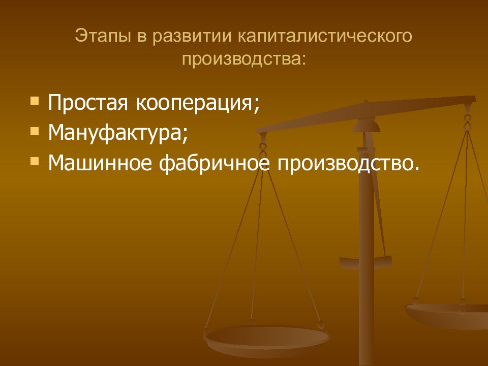 Простая кооперация; Мануфактура; Машинное фабричное производство.
