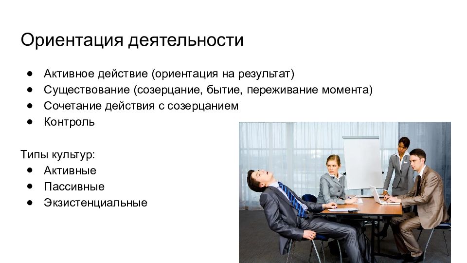 Активное действие (ориентация на результат) Существование (созерцание, бытие, переживание момента) Сочетание действия с созерцанием Контроль Типы культур: Активные Пассивные Экзистенциальные