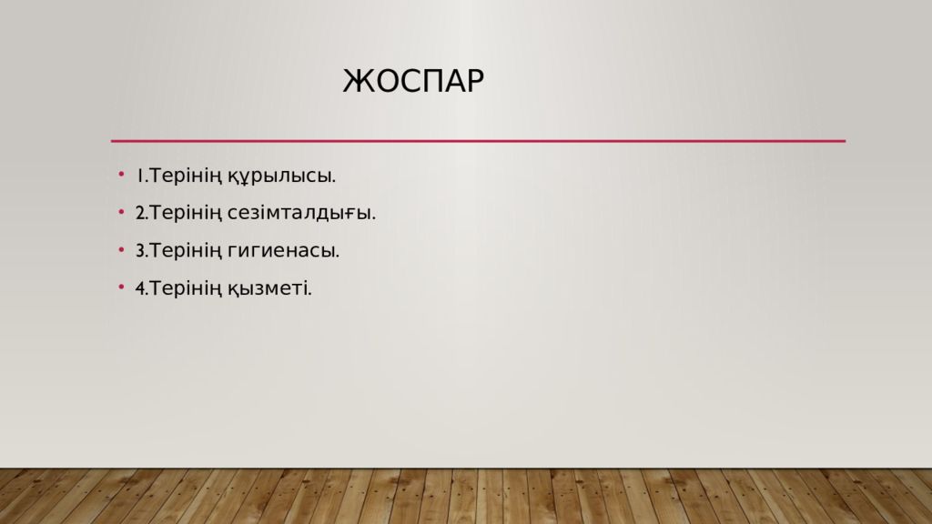 1.Терінің құрылысы. 2.Терінің сезімталдығы. 3.Терінің гигиенасы. 4.Терінің қызметі.