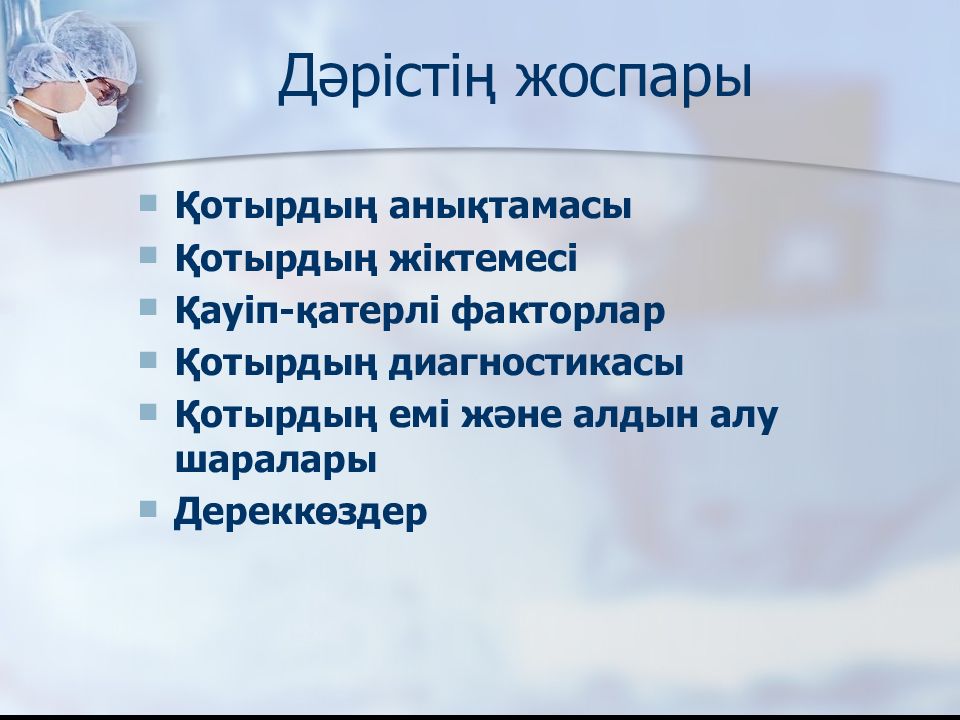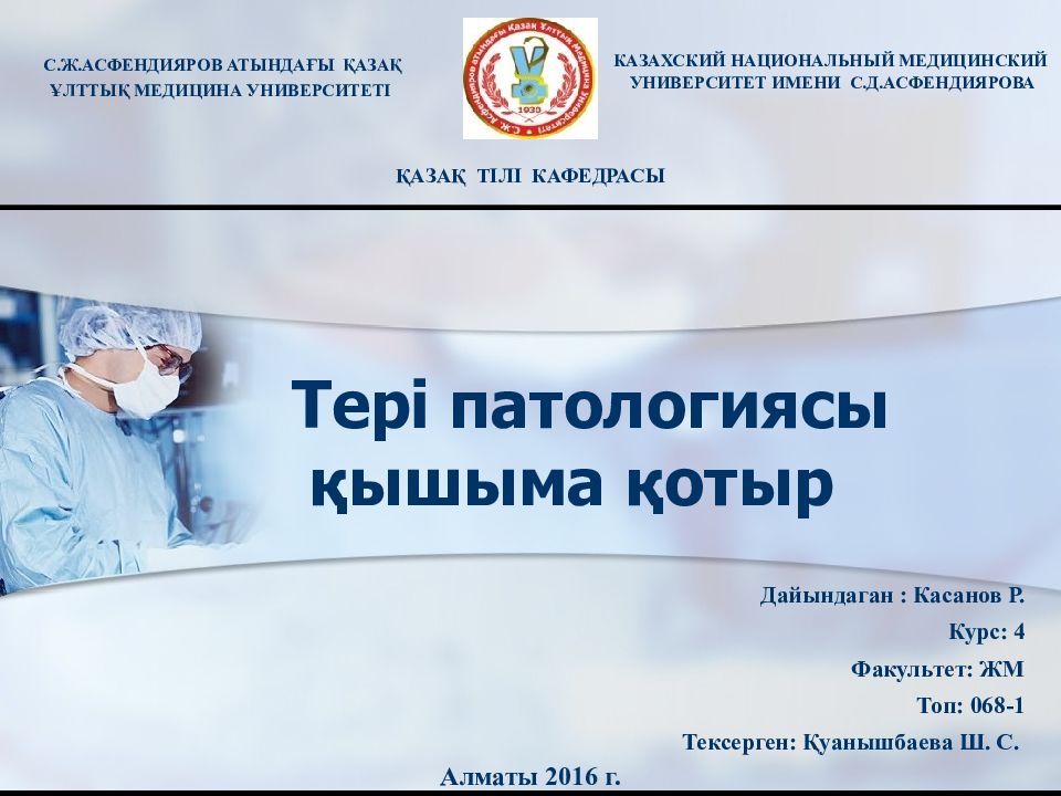 Дайындаган : Касанов Р. Курс : 4 Факультет: ЖМ Топ: 068-1 Тексерген : Қуанышбаева Ш. С. С.Ж.АСФЕНДИЯРОВ АТЫНДАҒЫ ҚАЗАҚ ҰЛТТЫҚ МЕДИЦИНА УНИВЕРСИТЕТІ КАЗАХСКИЙ НАЦИОНАЛЬНЫЙ МЕДИЦИНСКИЙ УНИВЕРСИТЕТ ИМЕНИ С.Д.АСФЕНДИЯРОВА ҚАЗАҚ ТІЛІ КАФЕДРАСЫ Алматы 2016 г.