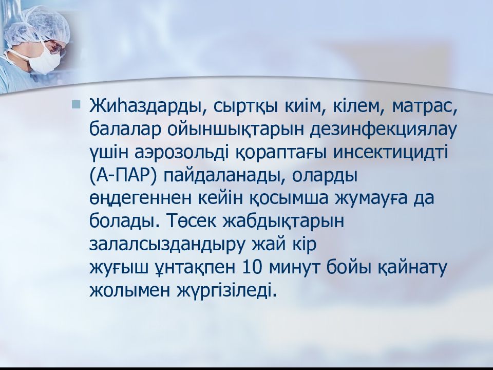 Жиһаздарды, сыртқы киім, кілем, матрас, балалар ойыншықтарын дезинфекциялау үшін аэрозольді қораптағы инсектицидті (А-ПАР) пайдаланады, оларды өңдегеннен кейін қосымша жумауға да болады. Төсек жабдықтарын залалсыздандыру жай кір жуғыш ұнтақпен 10 минут бойы қайнату жолымен жүргізіледі.