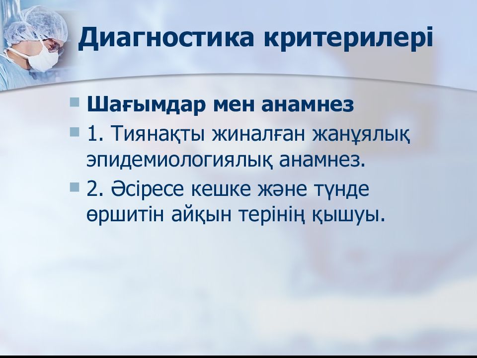 Шағымдар мен анамнез 1. Тиянақты жиналған жанұялық эпидемиологиялық анамнез. 2. Ə сіресе кешке ж ə не түнде өршитін айқын терінің қышуы.