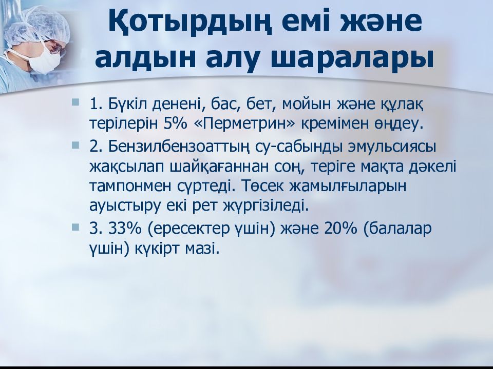 Слайд 14: Қотырдың емі және алдын алу шаралары