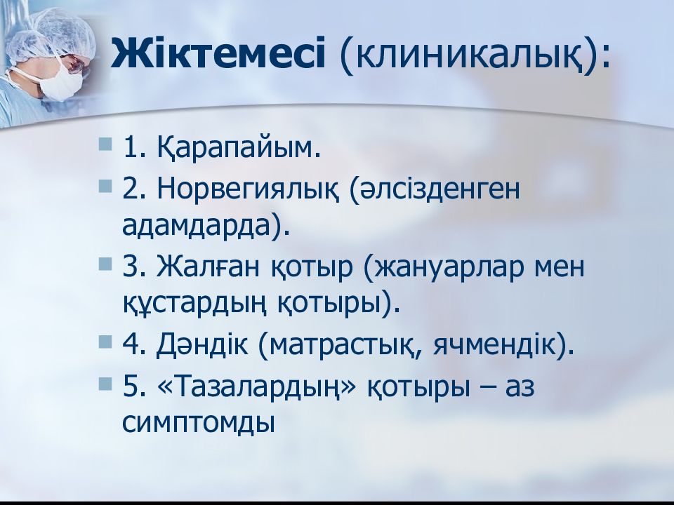 1. Қарапайым. 2. Норвегиялық ( ə лсізденген адамдарда ). 3. Жалған қотыр ( жануарлар мен құстардың қотыры ). 4. Д ə ндік (матрастық, ячмендік ). 5. «Тазалардың» қотыры – аз симптомды