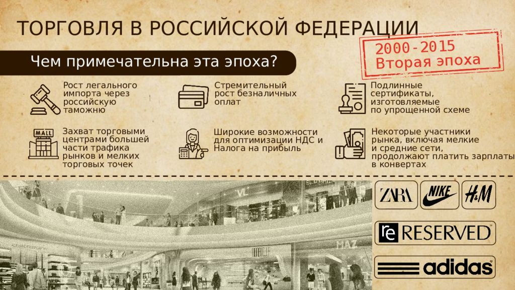 ТОРГОВЛЯ В РОССИЙСКОЙ ФЕДЕРАЦИИ 2000-2015 Вторая эпоха Чем примечательна эта эпоха? Рост легального импорта через российскую таможню Стремительный рост безналичных оплат Подлинные сертификаты, изготовляемые по упрощенной схеме Захват торговыми центрами большей части трафика рынков и мелких торговых точек Широкие возможности для оптимизации НДС и Налога на прибыль Некоторые участники рынка, включая мелкие и средние сети, продолжают платить зарплаты в конвертах