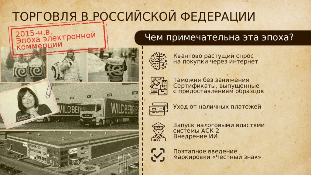 Чем примечательна эта эпоха? Квантово растущий спрос на покупки через интернет Уход от наличных платежей Таможня без занижения Сертификаты, выпущенные с предоставлением образцов Запуск налоговыми властями системы АСК-2 Внедрение ИИ Поэтапное введение маркировки «Честный знак» ТОРГОВЛЯ В РОССИЙСКОЙ ФЕДЕРАЦИИ 2015-н.в. Эпоха электронной коммерции Татьяна Бакальчук