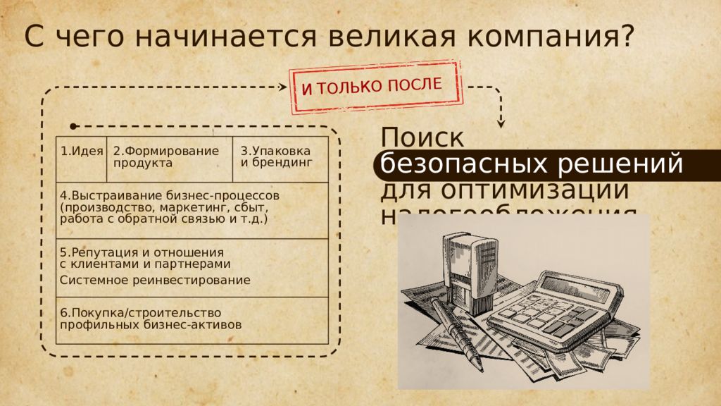 С чего начинается великая компания? 1.Идея 5.Репутация и отношения с клиентами и партнерами 2.Формирование продукта 3.Упаковка и брендинг 4.Выстраивание бизнес-процессов (производство, маркетинг, сбыт, работа с обратной связью и т.д.) 6.Покупка/строительство профильных бизнес-активов Системное реинвестирование Поиск безопасных решений для оптимизации налогообложения И ТОЛЬКО ПОСЛЕ