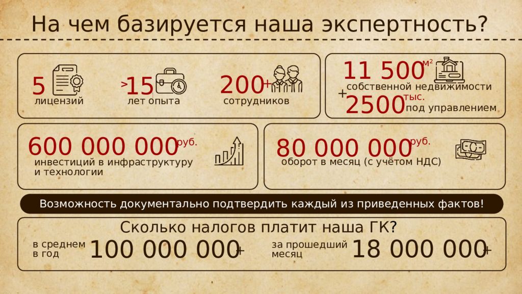 Сколько налогов платит наша ГК ? 100 000 000 в среднем в год + 18 000 000 за прошедший месяц + Возможность документально подтвердить каждый из приведенных фактов! На чем базируется наша экспертность? 5 лицензий > 15 лет опыта сотрудников + 200 собственной недвижимости 11 500 м 2 2500 + тыс. под управлением 600 000 000 руб. инвестиций в инфраструктуру и технологии 80 000 000 оборот в месяц (с учётом НДС) руб.