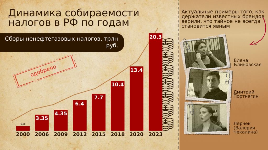 Сборы ненефтегазовых налогов, трлн руб. Динамика собираемости налогов в РФ по годам одобрено Лерчек (Валерия Чекалина) Дмитрий Портнягин Елена Блиновская Актуальные примеры того, как держатели известных брендов верили, что тайное не всегда становится явным