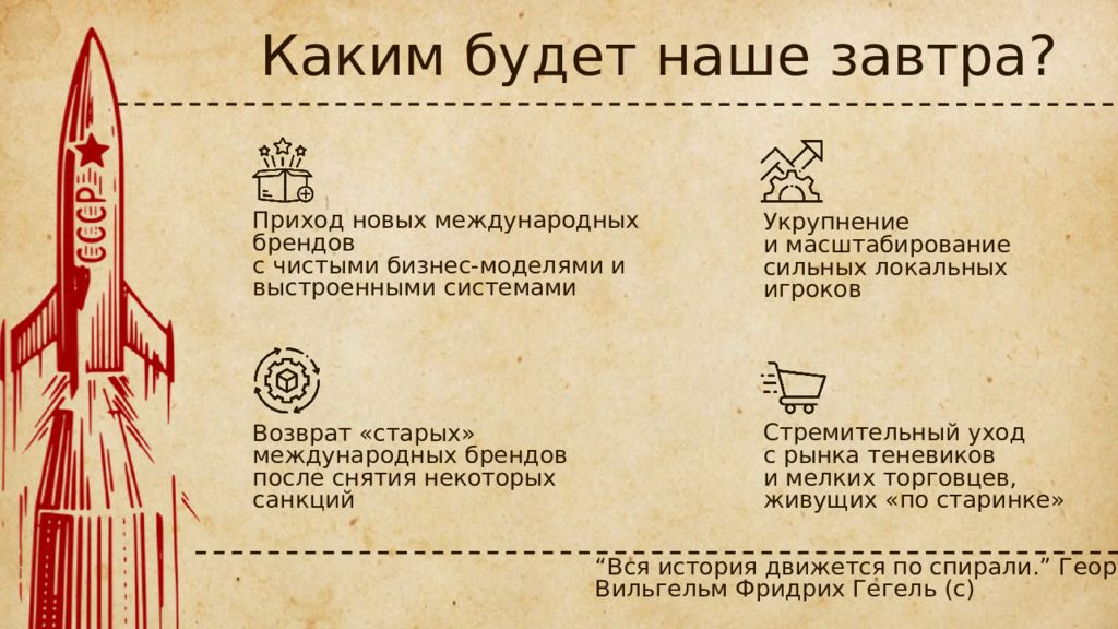 Каким будет наше завтра? “ Вся история движется по спирали. ” Георг Вильгельм Фридрих Гегель (с) Возврат «старых» международных брендов после снятия некоторых санкций Укрупнение и масштабирование сильных локальных игроков Стремительный уход с рынка теневиков и мелких торговцев, живущих «по старинке» Приход новых международных брендов с чистыми бизнес-моделями и выстроенными системами