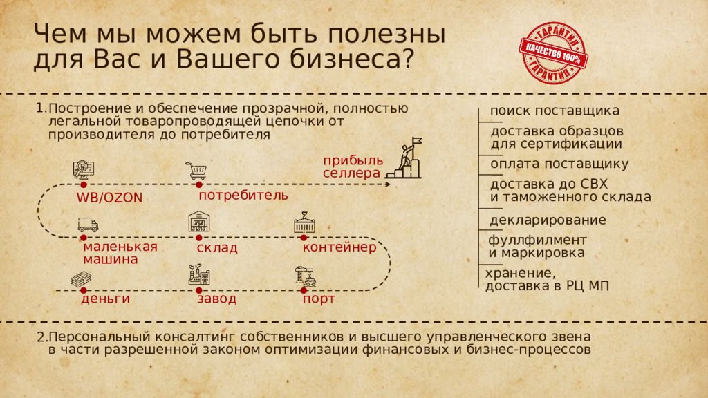 Персональный консалтинг собственников и высшего управленческого звена в части разрешенной законом оптимизации финансовых и бизнес-процессов Чем мы можем быть полезны для Вас и Вашего бизнеса? Построение и обеспечение прозрачной, полностью легальной товаропроводящей цепочки от производителя до потребителя прибыль селлера потребитель W B / OZON маленькая машина склад контейнер порт завод деньги 1. доставка до СВХ и таможенного склада хранение, доставка в РЦ МП поиск поставщика доставка образцов для сертификации оплата поставщику декларирование фуллфилмент и маркировка 2.