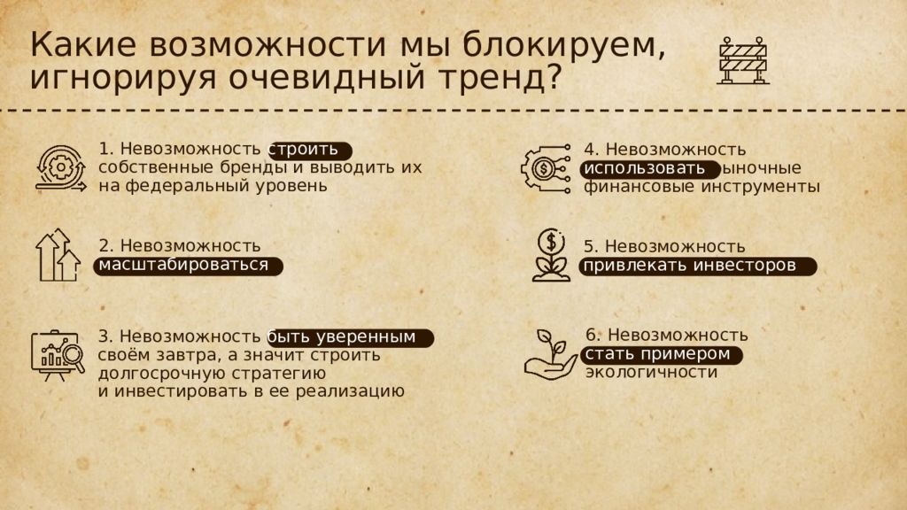 Какие возможности мы блокируем, игнорируя очевидный тренд? 1. Невозможность строить собственные бренды и выводить их на федеральный уровень 2. Невозможность масштабироваться 4. Невозможность использовать рыночные финансовые инструменты 5. Невозможность привлекать инвесторов 3. Невозможность быть уверенным в своём завтра, а значит строить долгосрочную стратегию и инвестировать в ее реализацию 6. Невозможность стать примером экологичности