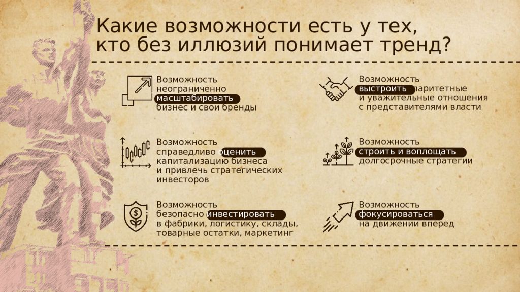 Возможность неограниченно масштабировать бизнес и свои бренды Возможность выстроить паритетные и уважительные отношения с представителями власти Возможность строить и воплощать долгосрочные стратегии Возможность фокусироваться на движении вперед Какие возможности есть у тех, кто без иллюзий понимает тренд? Возможность справедливо оценить капитализацию бизнеса и привлечь стратегических инвесторов Возможность безопасно инвестировать в фабрики, логистику, склады, товарные остатки, маркетинг