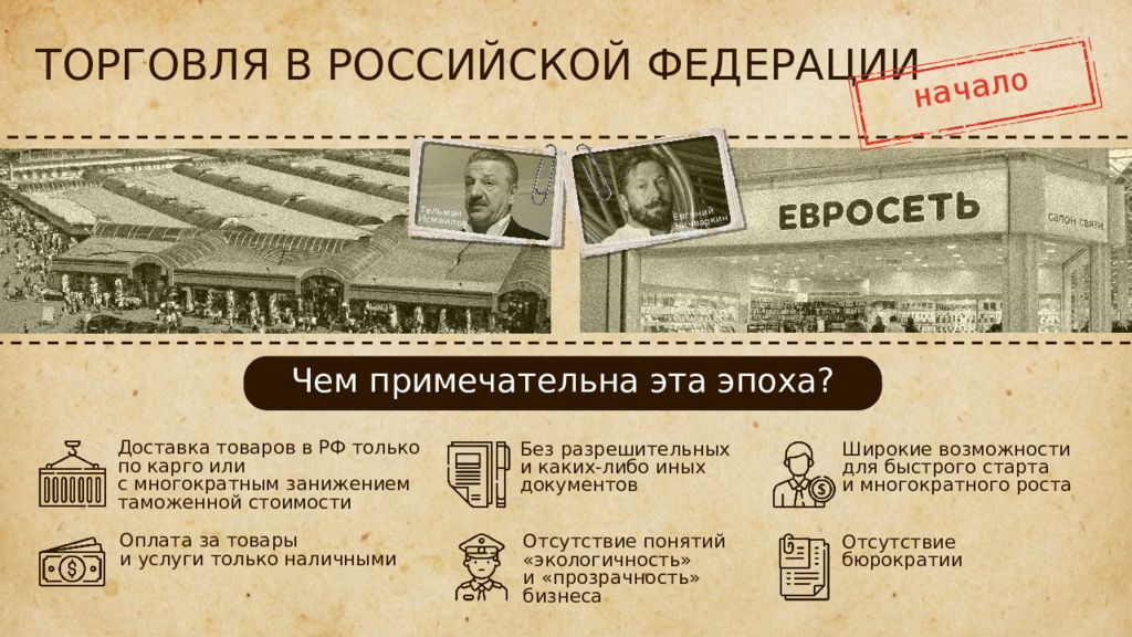ТОРГОВЛЯ В РОССИЙСКОЙ ФЕДЕРАЦИИ Доставка товаров в РФ только по карго или с многократным занижением таможенной стоимости Оплата за товары и услуги только наличными Без разрешительных и каких - либо иных документов Отсутствие понятий «экологичность» и «прозрачность» бизнеса Широкие возможности для быстрого старта и многократного роста Отсутствие бюрократии Чем примечательна эта эпоха? начало Тельман Исмаилов Евгений Чичваркин