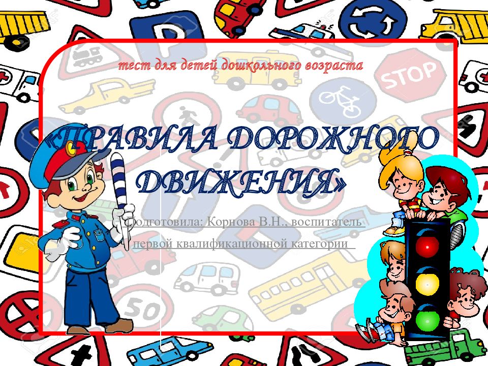 Первый слайд презентации: тест для детей дошкольного возраста «ПРАВИЛА ДОРОЖНОГО ДВИЖЕНИЯ»