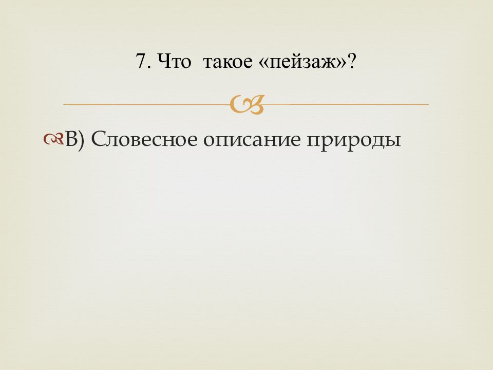 В) Словесное описание природы 7. Что такое «пейзаж»?
