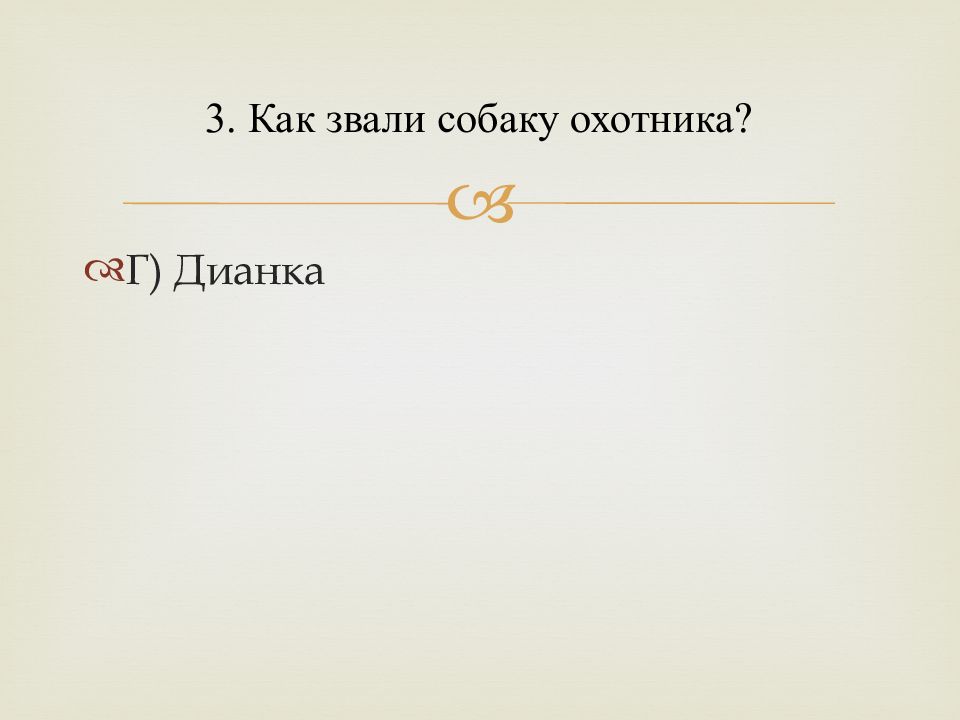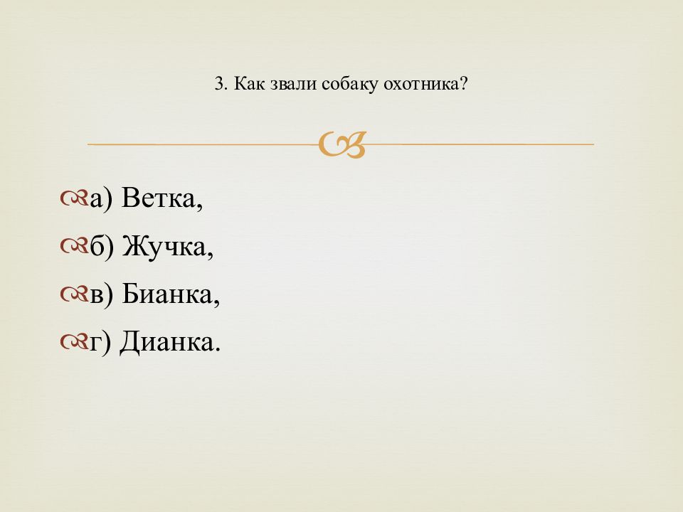 а ) Ветка, б) Жучка, в) Бианка, г) Дианка. 3. Как звали собаку охотника?