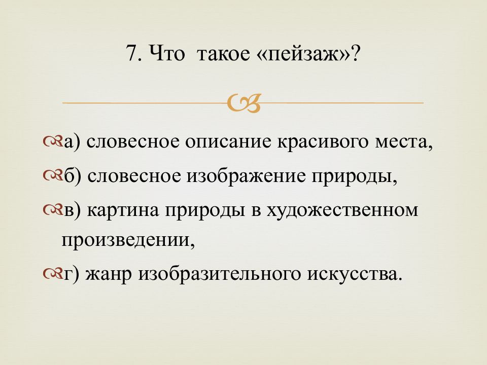 а ) словесное описание красивого места, б) словесное изображение природы, в) картина природы в художественном произведении, г) жанр изобразительного искусства. 7. Что такое «пейзаж»?