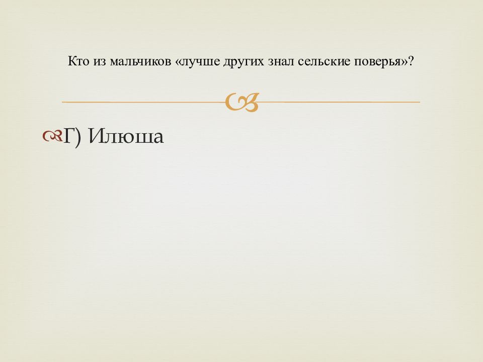 Г) Илюша Кто из мальчиков «лучше других знал сельские поверья»?
